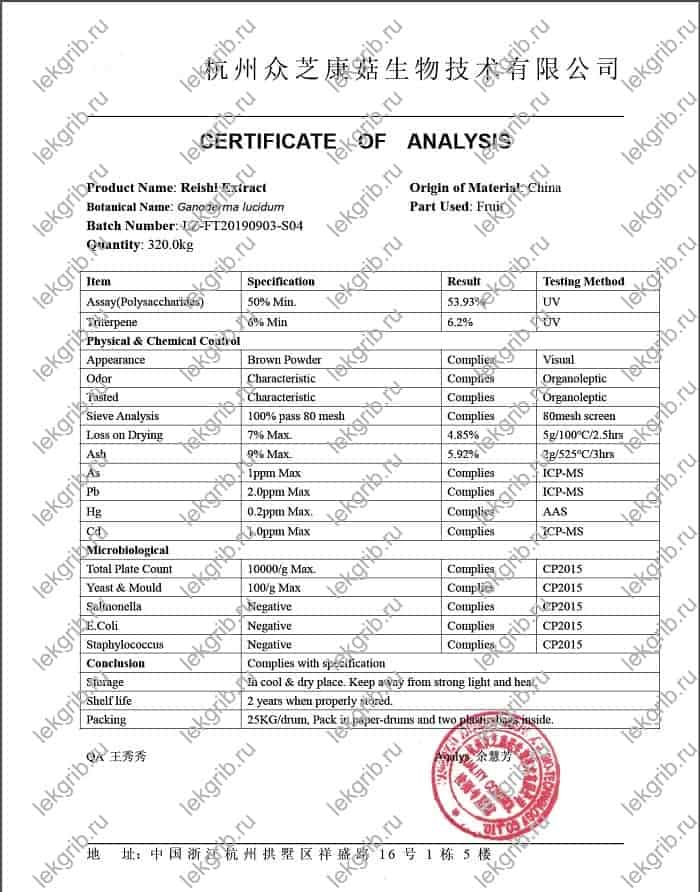 Лечебно-профилактическое действие гриба Рейши в основном обусловлен очень высоким содержанием в его составе полисахаридов, тритерпеноидов и германия. Экстракт Рейши эффективно воздействует при различных состояниях.